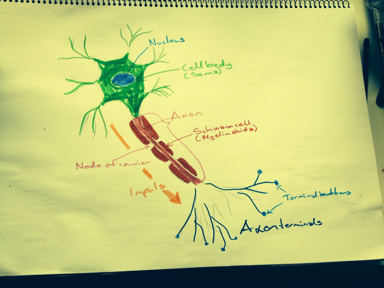 Nedan ser ni ett exempel på hur vi fick lära oss att rita upp neuronens delar! Jag tror att det är viktigt att förstå hur neuronen fungerar för att kunna förstå hur hjärnan fungerar, därav denna vackra bild! I nästa avsnitt beskriver jag synapsen och hur den går till!