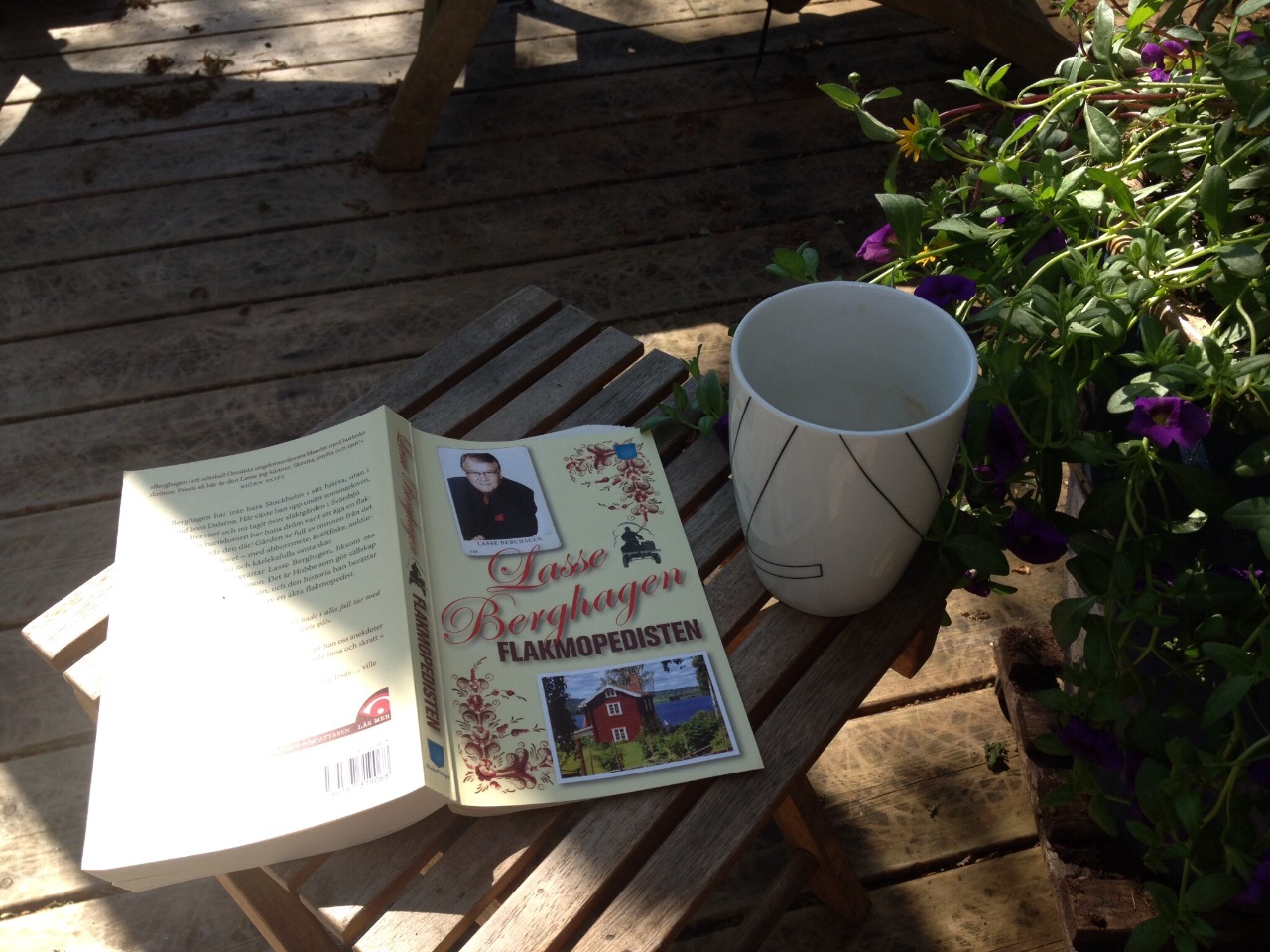 Jag kände mig hyfsat utvilad efteråt och eftersom solen bjuder på en fantastisk försommar så kunde jag sätta mig på altanen med en bok och njuta! Inte vilken bok som helst heller, utan Lasse Berghagens bok "Flakmopedisten", Nu ler mina väninnor i bokklubben, för vi har gemensamt dömt ut honom efter att han på baksidan av "Hundraåringen" sagt att det var den bästa bok han läst och vi tyckte i kör att det var den sämsta bok vi läst trots mediernas lovord. Antar att vi tillhör fel generation helt enkelt. Lasse Berghagen och Hundraåringen har säkert sina fans, men jag tillhörde alltså inte ett av dem. Hur kommer det sig då att jag sitter och läser en bok av tidigare sagda man?