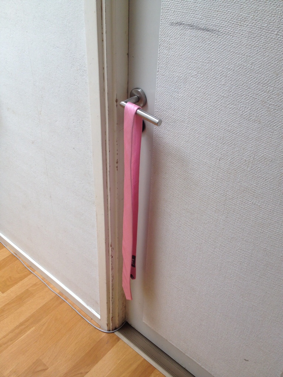 Det hänger en slips på dörrhandtaget till mitt sovrum...