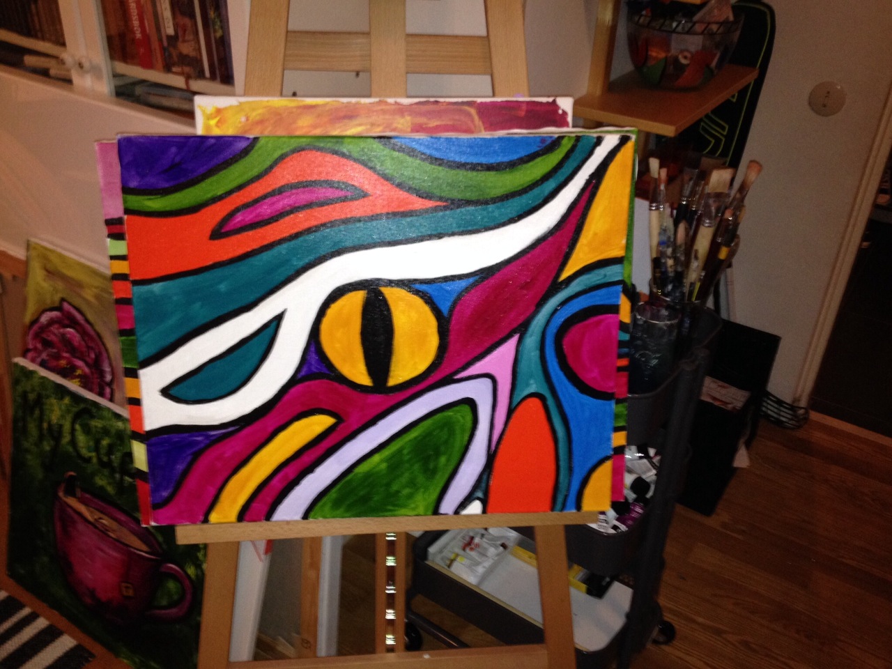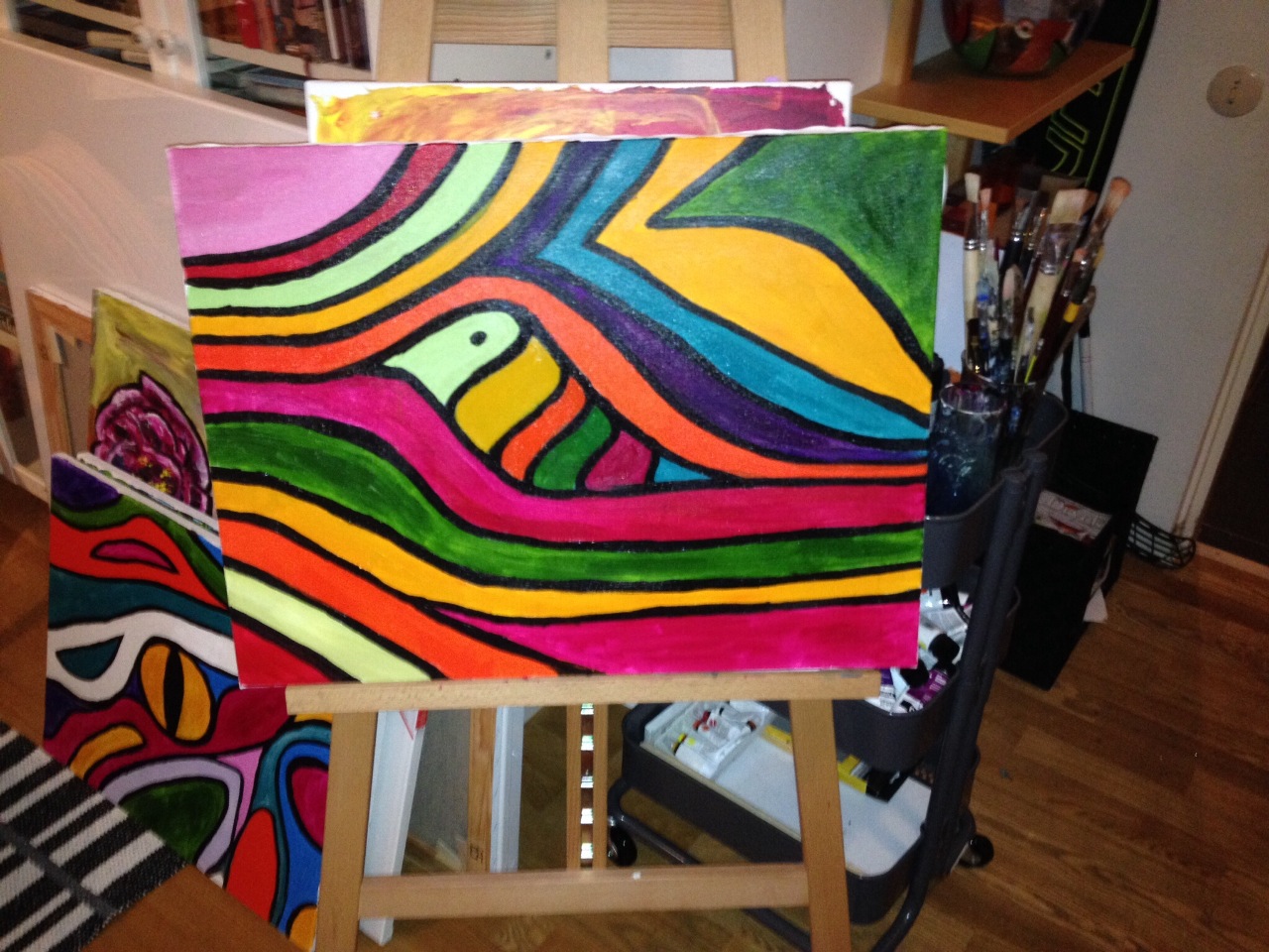 Jag beslutade mig för att färgsätta lite av mitt typiska telefonklotter i mina senaste tavlor. Den här typen av klotter, eller engelskans "doodles" ,hittade man nästan överallt där jag varit uttråkad och penna och papper fanns tillgängligt! Tycker att det är lite fascinerande att använda sig av ett så "fint" medie som akrylfärg för att återge något så "fult" som telefonklotter. I framtiden kommer det kanske inte heta telefonklotter utan skypeklotter istället? Vad tror ni?