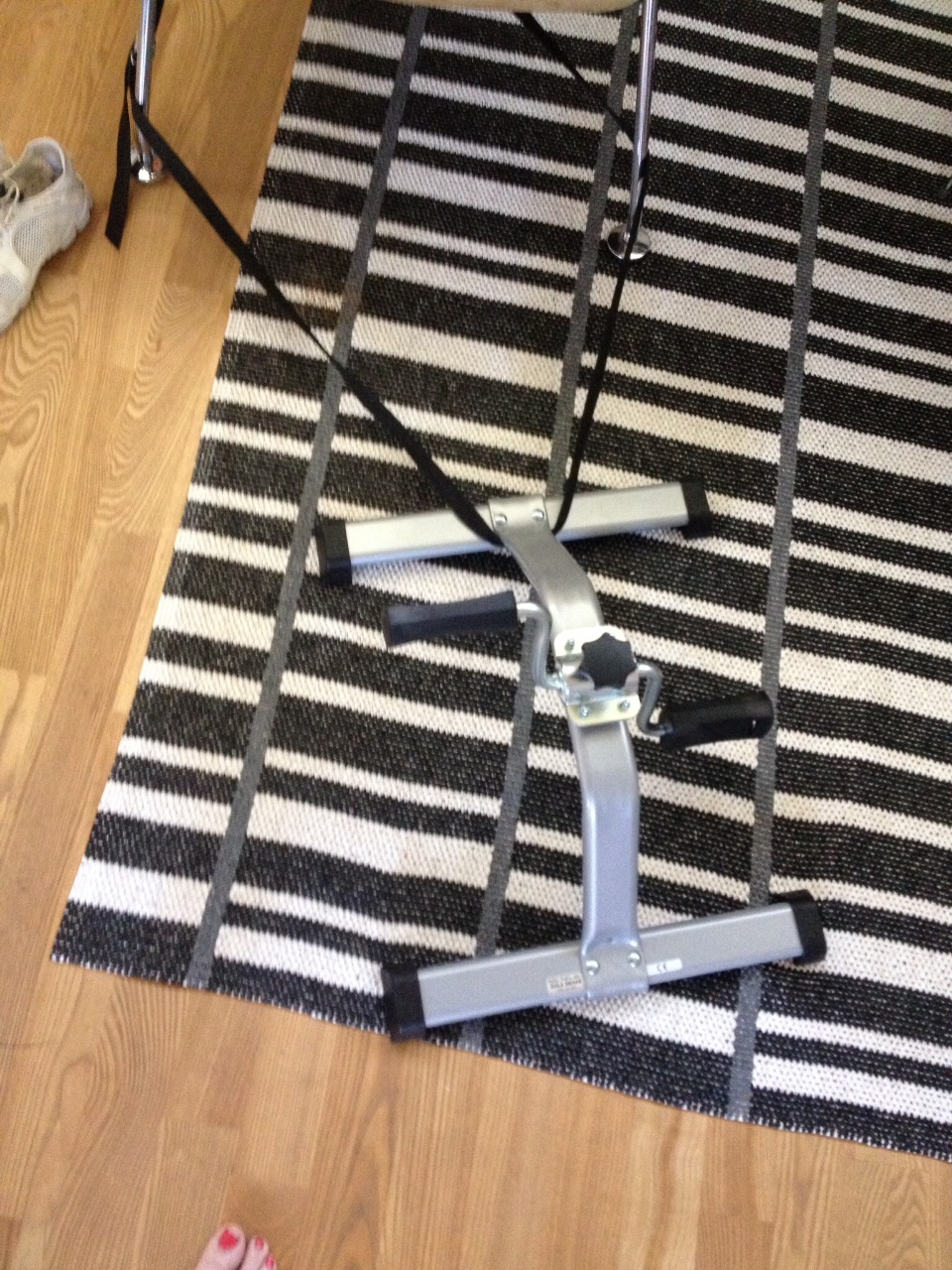 Men nu har jag hittat lösningen! Den kostade inte tusentals kronor och tar inte upp flera kvadratmeter i utrymme, och den har ingen Fancy display, men den fungerar! Sängcykel kallas det visst och används främst av äldre för att få igång blodcirkulationen i benen. Med denna skapelse kan jag sätta mig själv och trampa när jag har lust och ork utan att behöva ta hjälp och även om den inte bjuder något enorm motstånd så är det i alla fall tillräckligt för att få upp ett flås och det är egentligen allt jag begär! En bra dag skall jag plugga in lurarna och lyssna på musik samtidigt som jag trampar, då blir det nästan som ett spinningpass (fast utan svetten)!